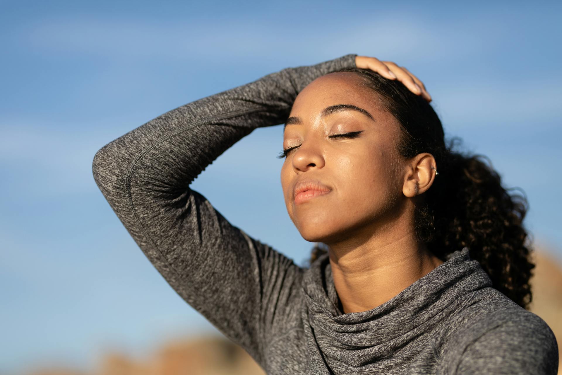 Woman practicing calm self-regulation, eyes closed in a moment of stillness